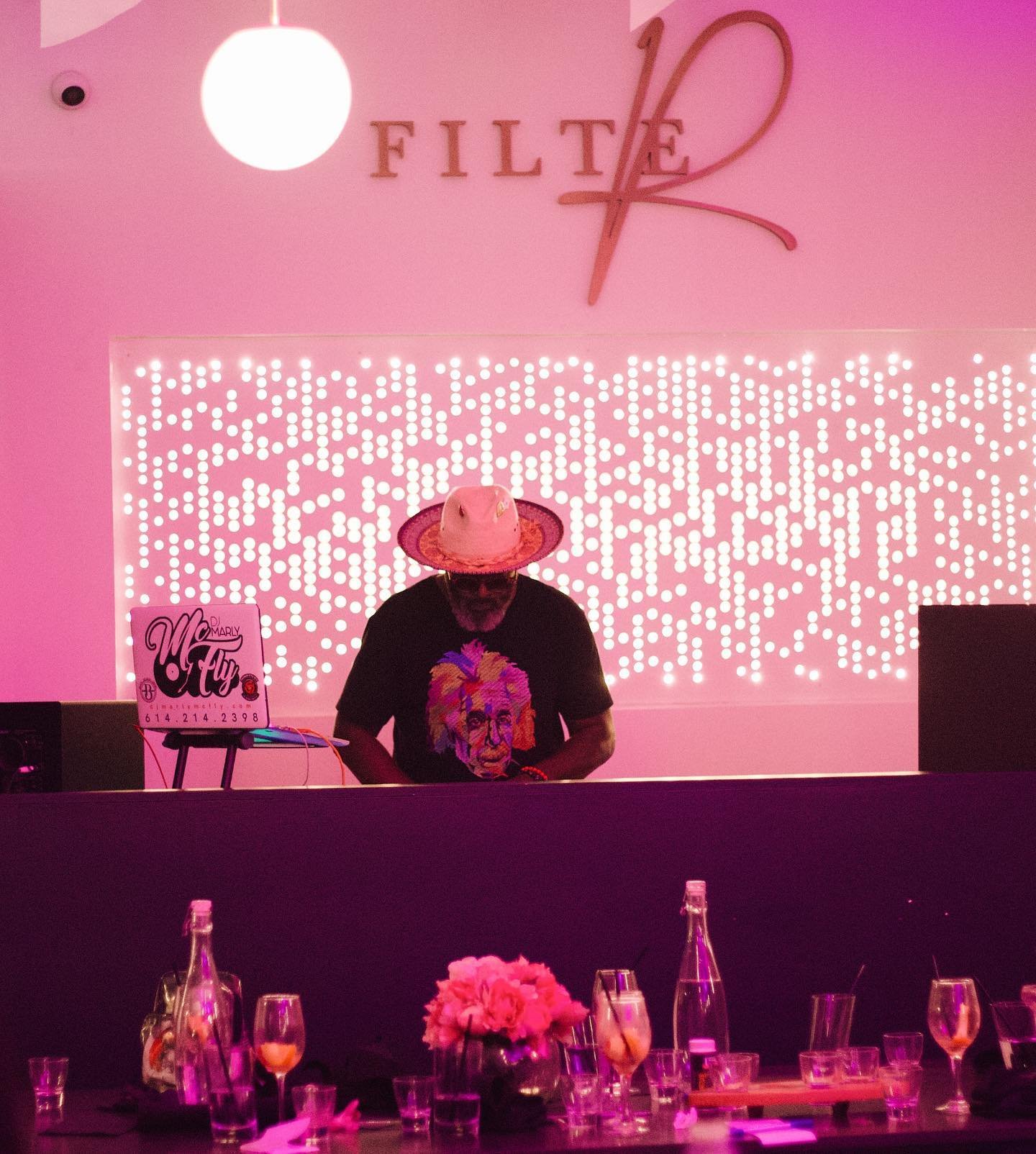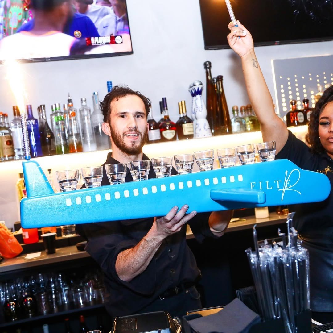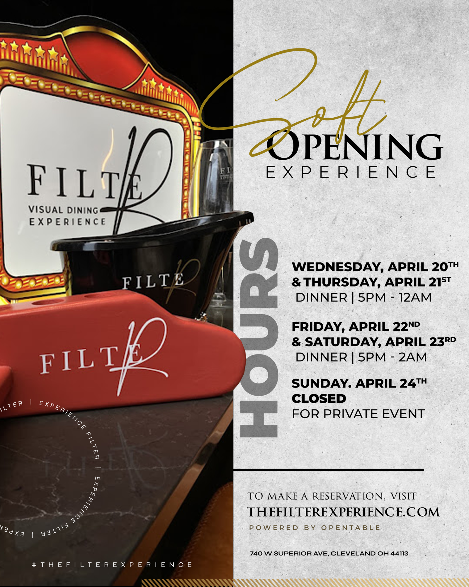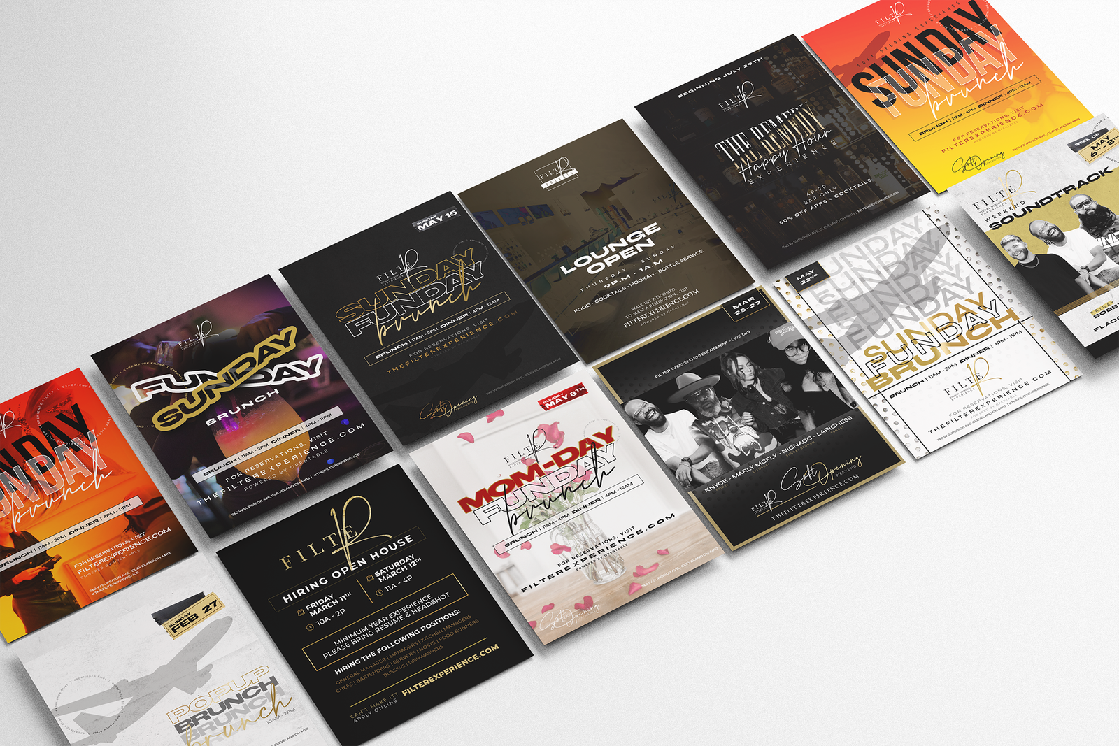Dual-Function Marketing Strategy Filter operates on two schedules and serves two audiences, so the marketing needed to flex accordingly. Daytime brunch and dinner marketing uses warm, vibrant imagery – like the orange/red duotone Sunday Funday campaigns that feel energetic and welcoming. Nighttime event marketing leans into urban sophistication – moody photography, metallic accents, private jet imagery that creates aspiration without exclusion. Celebrity appearance graphics balance both worlds: clean layouts that feel upscale while letting the talent photography carry street credibility.