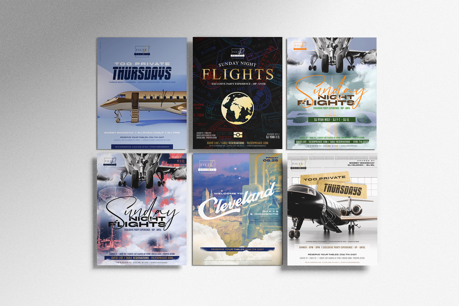 Event Series Branding Each recurring event needed its own visual identity while staying in the Filter ecosystem. “Too Private Thursdays” uses navy, white, and that signature gold with private jet imagery for throwback nights. “Sunday Night Flights” during Browns games combines football culture with luxury cues – golden airplanes, bold typography, sports energy filtered through an upscale lens. The weekly DJ lineups get darker, moodier treatments with prominent photography and minimalist type lockups.